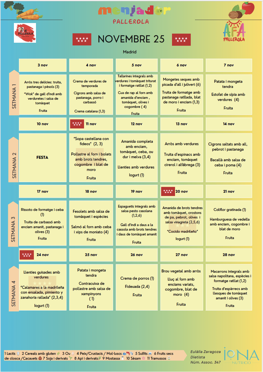 - MENJADOR: Horari de 13 a 15 hores. S’ofereix dinar amb cuina pròpia (entra el picnic el dia que fem sortides de tot el dia).